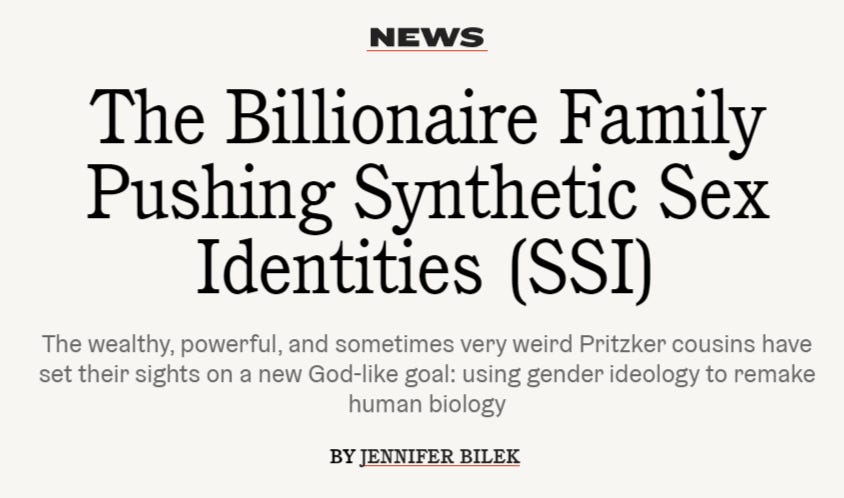 While many Americans are still trying to understand why women are being erased in language and law, and why children are being taught they can choose their sex, the Pritzker cousins and others may be well on their way to engineering a new way to be human. But what could possibly explain the abrupt drive of wealthy elites to deconstruct who and what we are and to manipulate children’s sex characteristics in clinics now spanning the globe while claiming new rights for those being deconstructed? Perhaps it is profit. Perhaps it is the pleasure of seeing one’s own personal obsessions writ large. Perhaps it is the human temptation to play God. No matter what the answer is, it seems clear that SSI will be an enduring part of America’s future.
