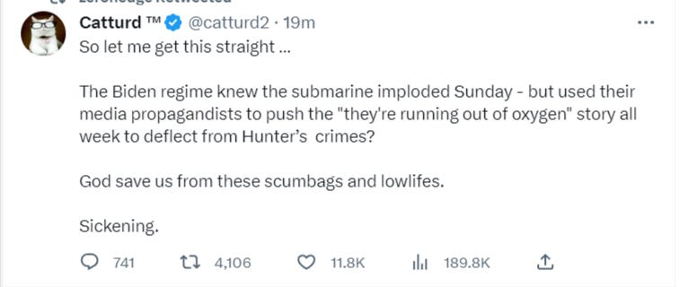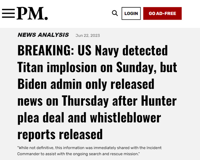 And if that wasn’t bad enough, it turned out that the U.S. Navy had detected the sub’s destruction from the moment it happened, but was likely silenced by the Biden regime in order to fog the airwaves with the diversionary disaster in order to obscure the ongoing Hunter Biden scandal peaking at the time: