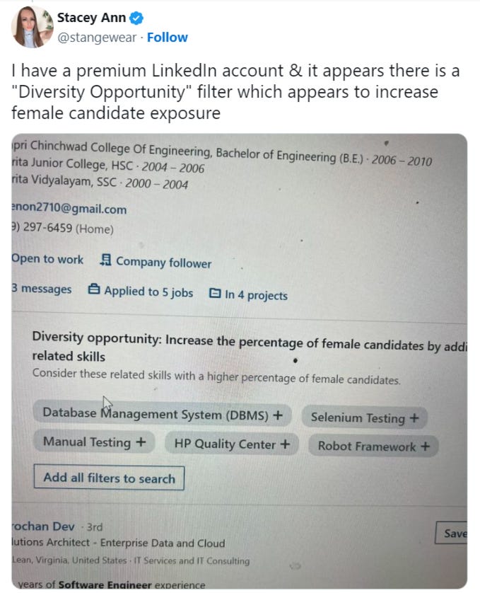 For instance, veiled beneath the typical obscurant and ambiguous language, LinkedIn recently rolled out platform options for recruiters to filter potential talent by their race: