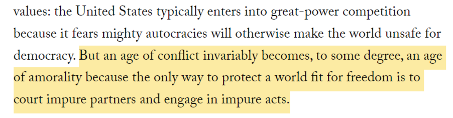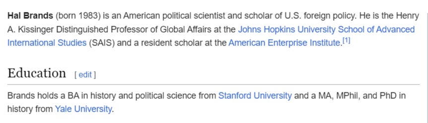 Ultimately, the author of the Foreign Affairs piece on amorality above, Hal Brands, is a fitting example of this very pipeline. A glimpse of his wiki shows he not only bears the ‘distinguishing’ mark of some Henry A. Kissinger plaudit—precisely the type of Rhodes Scholar pipeline-for-the-elites I spoke of—but that he even attended not one, but two of the 12 ‘chosen’ institutions singled out by Rasmussen: