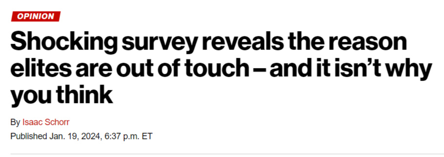 But one of the most revealing disparities in the Rasmussen survey showed just how out of touch the elites are specifically to economic issues which affect the plebs most—as opposed to the airy abstractions of fringe intellectual culture war issues: