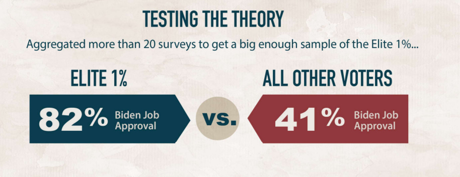 Here you can see that a whopping 82% of elites believe Biden is succeeding on jobs—which by extension means approval of the economy. Only 41% of voters think so.