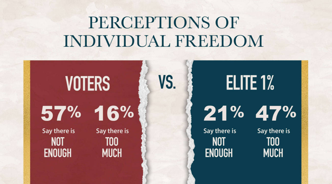 Nearly 60% of regular voters believe there is not enough freedom, while only 21% of the elites do so. A shocking nearly 50% of elites believe there is too much freedom, while only 16% of voters think so.
