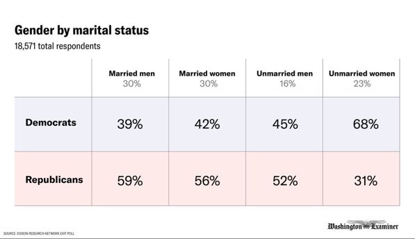 As everyone is now aware, unmarried women by far make the most disproportionate jump into Democrat Land, as well as increasingly radicalized hyperliberal policies—which reflects in other interesting ways:
