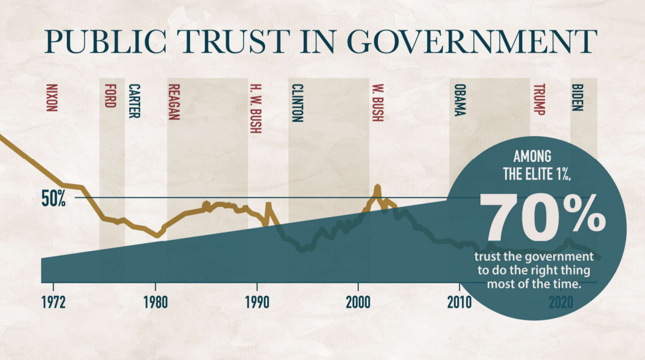 But the mechanism most strongly behind this fault-line has the following wellspring: 70% of elites trust the government, while only a miniscule less than ~20% of the public does: