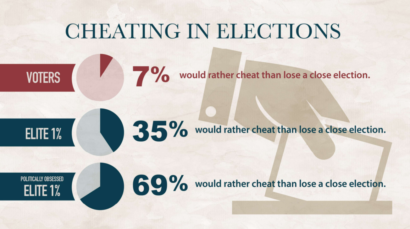 Rasmussen said that this project has revealed the scariest single polling number he has seen in nearly 35 years of studying popular opinion. According to his data, 35 percent of the elite 1 percent (and 69 percent of the politically obsessed elite 1 percent) said they would rather cheat than lose a close election. Among average Americans, 93 percent reject cheating and accept defeat in an honest election. Only 7 percent reported they would cheat. -source