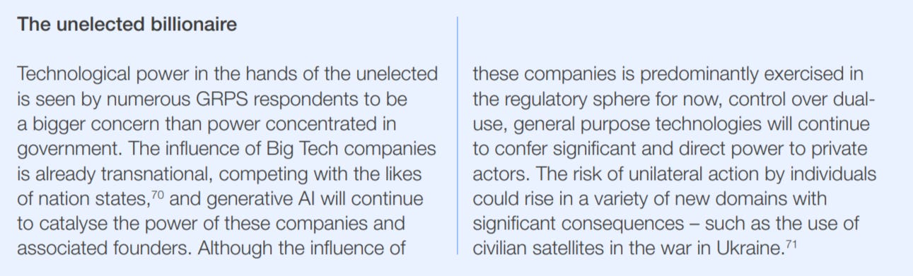 They do come close to a semblance of self-awareness in the next section, where they cite unelected billionaires propelled to new heights of power and influence by the AI age as particular worries: