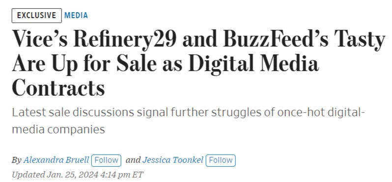 BuzzFeed, whose stock has lost more than 97% of its value since the company went public in 2021, is looking to sell its food sites, Tasty and First We Feast, according to people familiar with the situation. Meanwhile, Fortress Investment Group, which took over Vice in bankruptcy last year, is in talks to sell its Refinery29 women’s lifestyle-focused site, other people said.