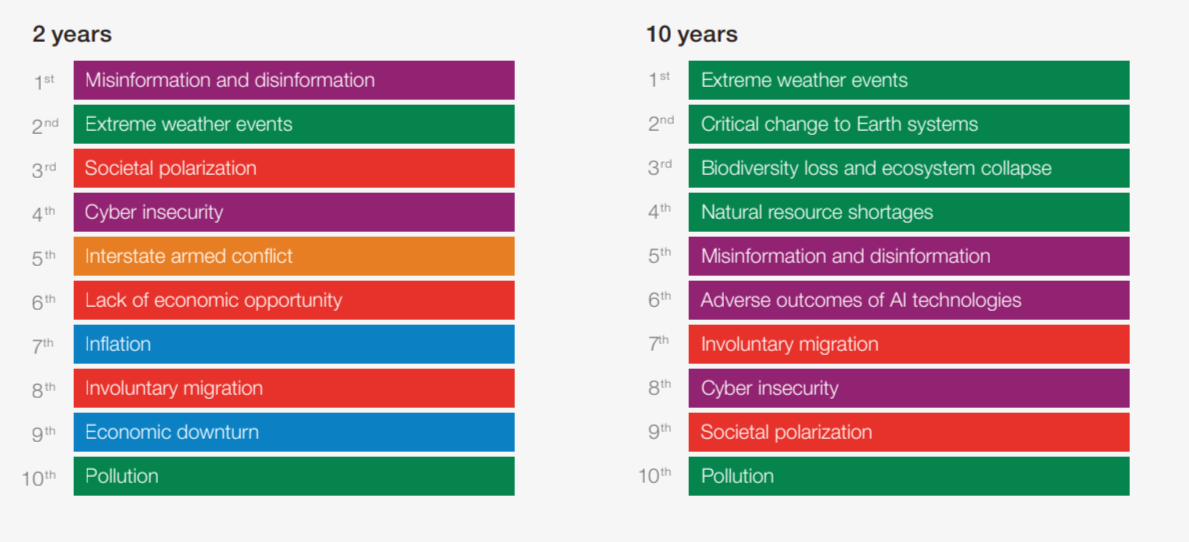 It’s clear that in the short term, mis/disinformation gives them the most sleepless nights. This is, according to them, owing to the fact that the next two years will be rife with crucial global elections during which disinformation will play a leading role. For the ten year outlook, they naturally beat the climate bongos full-tilt because that remains their savviest gravy train.