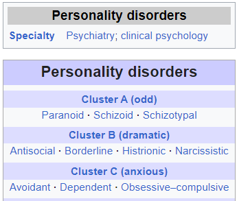For those unfamiliar, in clinical psychology personality disorders are split into three categories: