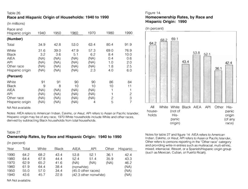 For instance, in the post-war building boom of the 1940s onward, when suburbs were going up all over the country, White America experienced an exuberant growth in home ownership from ~45% to nearly ~70% by 1990. Yet Blacks were left behind, having a paltry ~23% ownership rate in 1940, which increased to a middling ~43% by 1990.