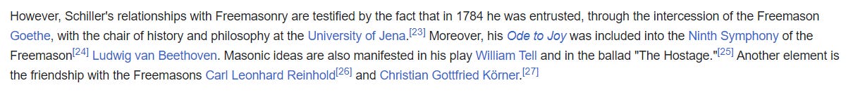 In fact, the direct Bavarian Illuminati and Masonic lineage through Kalergi’s work is quite scholastically evident. Beethoven was famously taught by Christian Neefe, a member of Weishaupt’s Illuminati order, who instilled in his young, idealistic pupil the ‘Enlightened’ precepts of Freemasonry and of the Illuminated. This was later echoed in Beethoven’s magnum opus, his Ode to Joy symphony no. 9, when he chose his fellow Mason, Schiller’s, poem Ode to Joy as the basis for his symphony’s lyrics. Schiller’s poem, extolling universal brotherhood, humanity’s triumph, and other Masonic virtues was already being widely set to music in Masonic lodges and Illuminati halls at that time.