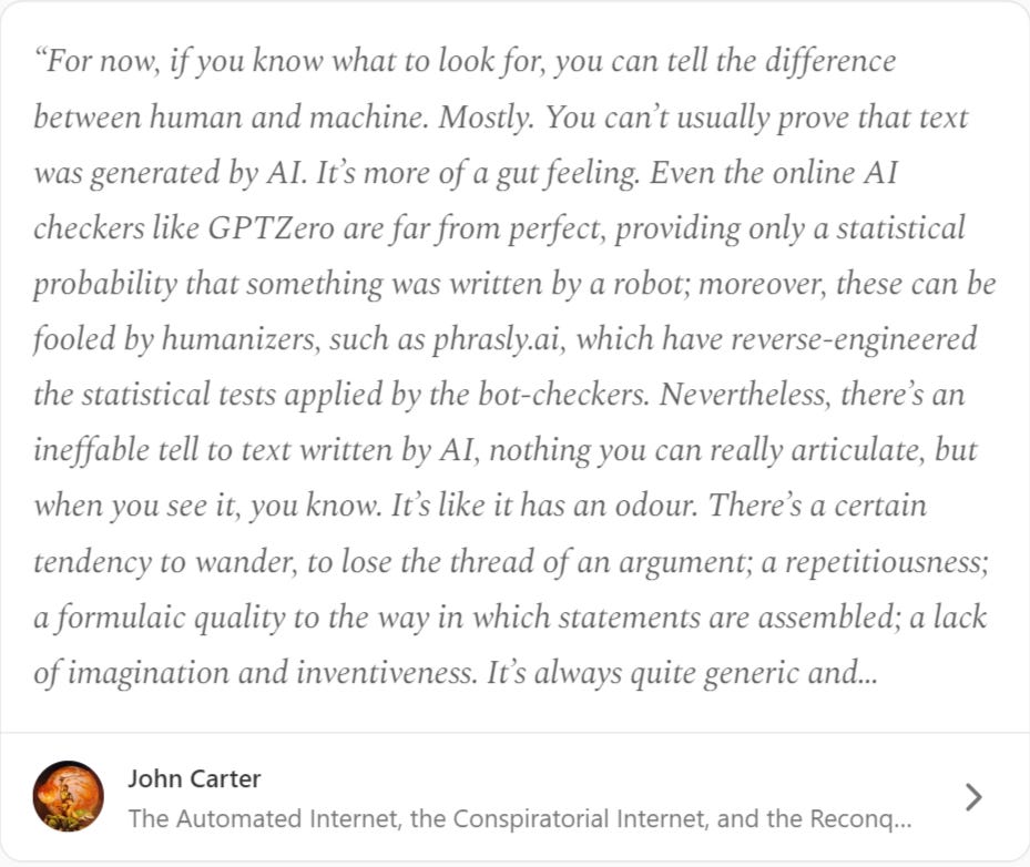 I used writing as a metaphor for the wider argument of commensurability between our humanness and AI puppetry. John Carter writes above that, despite getting ever more subtle, AI mimicry can—for the time being—still be picked out with a ‘gut feeling’; an intangible ersatz quality. But what is that ersatz thing? Ask an expert in any competitive field and they’ll tell you the magic always lies in the last 0.1% of creation. Here too, what encapsulates our very human ethos and subjectivity lies in that final ephemeral sliver, which conceals a vast gulf of separation between us and the imitation.