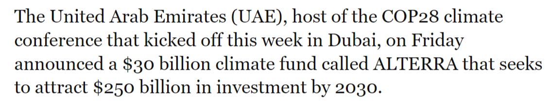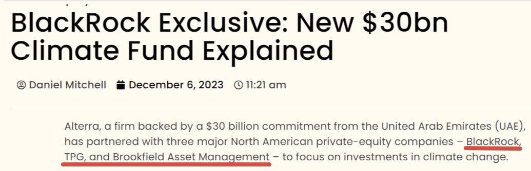 But getting back to COP28. At the adjournment of the summit, the UAE managed to seed a $30B fund called ALTERRA, while ultimately making a feeble concession on fossil fuel reductions. Not surprisingly, BlackRock is again at the forefront: