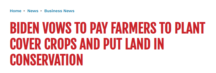 The government will help farmers mitigate climate change by paying them to “put their land in conservation” and plant cover crops, said President-elect Biden, providing some details on his campaign call to offset greenhouse gas emissions from agriculture. The sector accounts for roughly 10% of emissions nationwide.