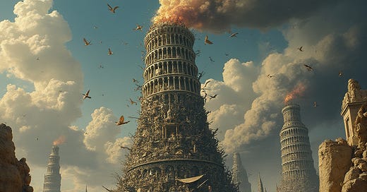 It again comes down to ignoring root causes, first principles. Society has grown into a sprawlingly complex Tower of Babel, erected on a bedrock of so much epistemic distortion, layer-caked with myths and obfuscations, criss-crossed with mazes of unspoken schemes, and crowned with a toppling minaret of rent extraction the craven elites can only prop up by plastering on layer after layer of outrageous artifice, like gargoyles of illogic dangling from broken cornices—an unnatural bricolaged horror so elephantine and unwieldy, that it stands to calve into biblical ash at any moment. But no one is honest or brave enough to voice that the only way to realign with the spiritus of our ancient unconscious is to raze the whole thing to the ground and start anew.